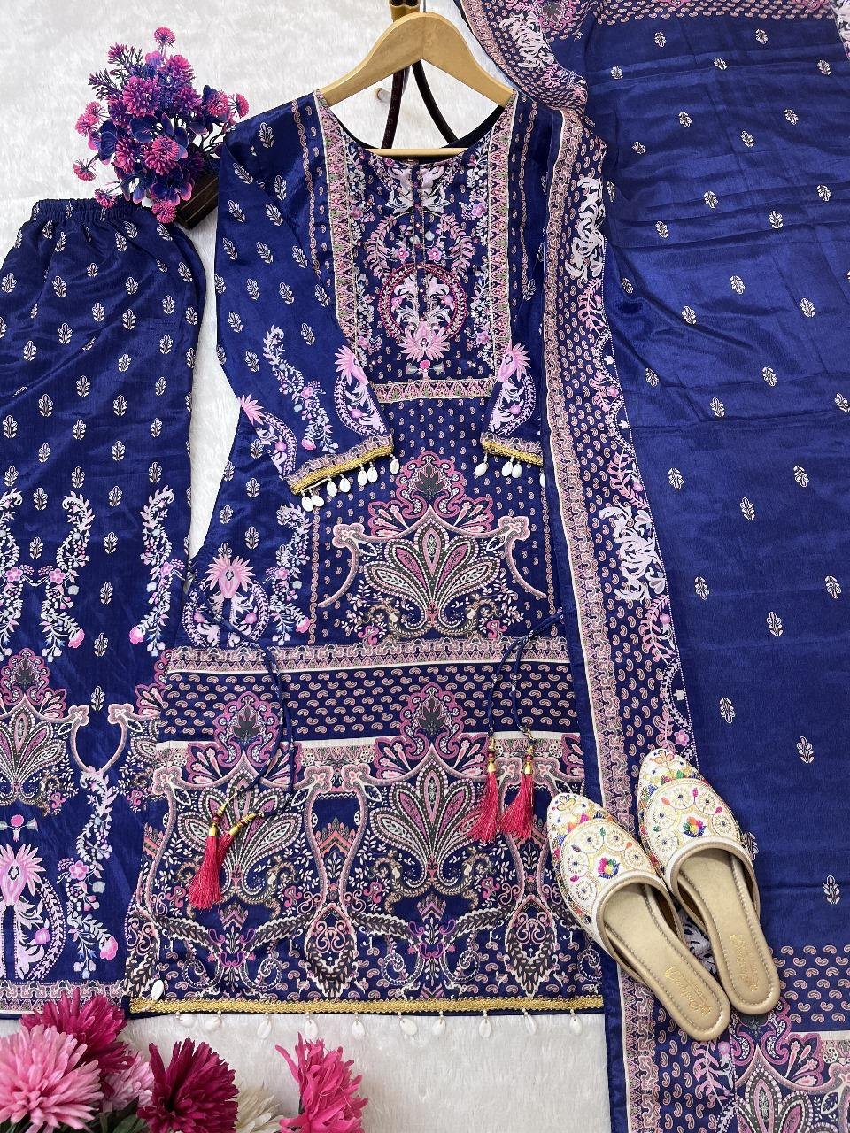 DESIGNER WEAR TRENDING TOP WITH PRINTED WORK WITH HAND WORK WITH PLAZO AND DUPATTA SET.